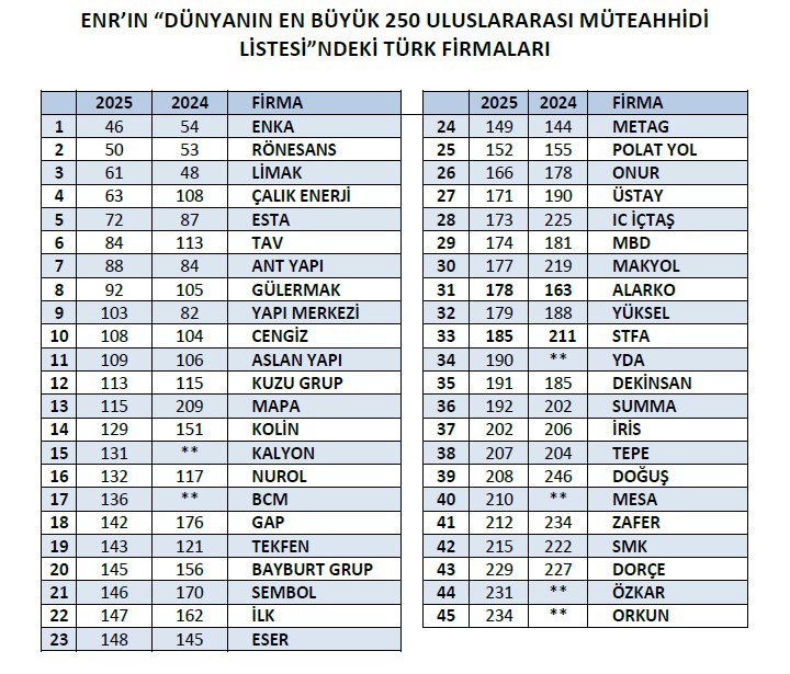 Türk firmalarının listede yükselişi de dikkat çekiyor. İlk 50 firma arasında 2 Türk firması, ilk 100 firma arasında ise 8 Türk firması yer alırken, enerji alt sektörü listesinde bir Türk firması da ilk 10’a girmeyi başardı. Geçen yıl açıklanan listede ilk 50 arasında 1, ilk 100 arasında 6 Türk firması bulunuyordu. Bu sonuç, Türkiye’nin küresel inşaat piyasasında gücünü ve rekabetçiliğini sürdürdüğünün somut bir göstergesi olarak öne çıkıyor.